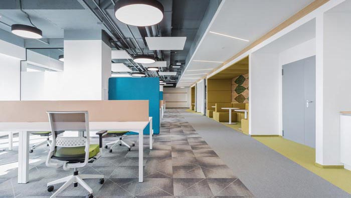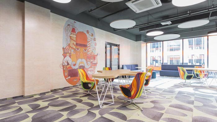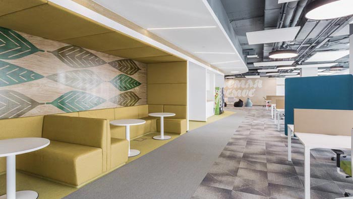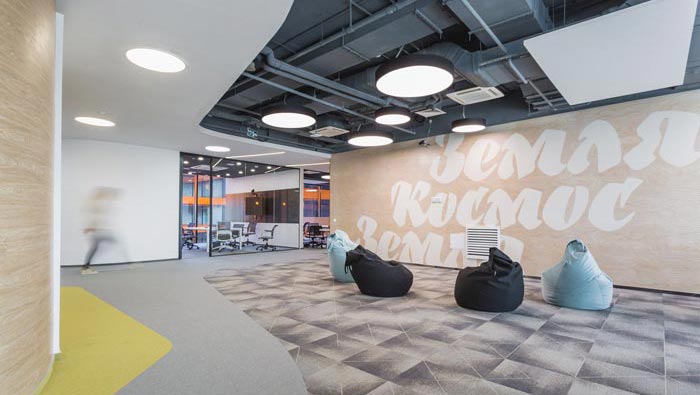 過(guò)道結(jié)合部的設(shè)計(jì):此處為整個(gè)企業(yè)的內(nèi)部交匯點(diǎn),在此處過(guò)道呈四面八方式分布,不管走哪一個(gè)方向都可以繞回原地,這也是一個(gè)大回型動(dòng)線設(shè)計(jì),故此設(shè)計(jì)師在設(shè)計(jì)中在此地開(kāi)辟出一片如凈土般的區(qū)域,以軟裝進(jìn)行鋪墊,讓員工、客戶在此處可以休息、娛樂(lè),可增可減的沙包型座椅,也在無(wú)形中成為一處亮點(diǎn)。