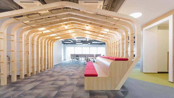 休息區(qū)域的設(shè)計(jì):設(shè)計(jì)師在設(shè)計(jì)的時(shí)候,采用了三位一體的設(shè)計(jì)手法,融合了過(guò)道、造型與休息區(qū)域,將一個(gè)過(guò)道空間改為空間的一處亮點(diǎn),上下兩層休息區(qū)域增加了容納能力,也增加了空間的流線造型,設(shè)計(jì)師希望為企業(yè)的每一處空間都留下一處讓人眼前一亮的設(shè)計(jì)。