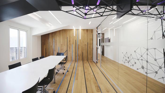 會議室的設(shè)計:此處采用的是加長版的會議桌,相信大家想起會議都會感覺十分枯燥,設(shè)計師也注意到這個問題,故此在設(shè)計中盡量減少多余的元素,將一切都融入于無形,木板之間的間距、射線在陽光的照射下,好似那突破突破壁障的一絲絲零星想法。