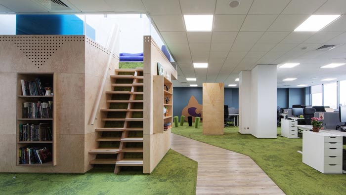 動線的設計:當我們沿著動線進入到內部空間的時候,綠色的地毯給空間帶來了絲絲生機,地板走廊好似森林中延伸的彎曲的小路,指引著我們走進空間的深處,同時也為辦公空間帶來了一絲神秘感,讓我們對空間充滿了好奇,這樣的設計為我們勾勒出一處童話的世界。