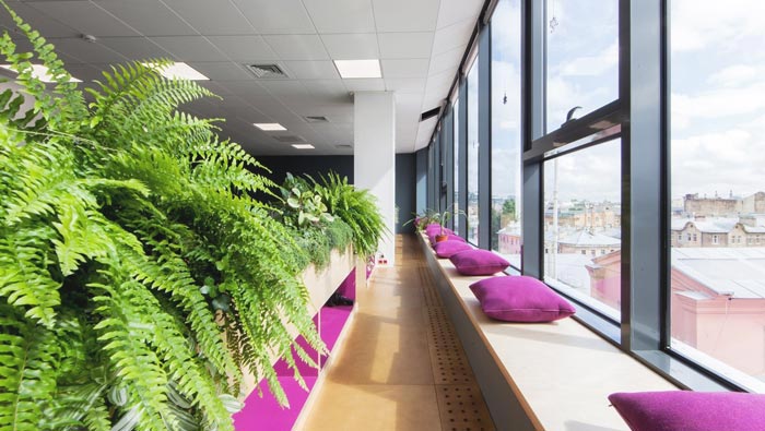 進門區域的設計:客戶進入后看到的一處生機勃勃的空間,這也這是設計師特意為之,在設計師看來不管是什么,第一印象都十分重要,故此設計師希望通過生機勃勃的進門區域,給客戶留下一個不錯的第一印象,同時生機勃勃也在一定程度上展示企業蓬勃發展的前景