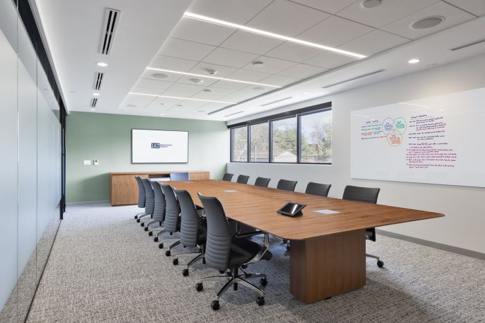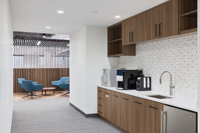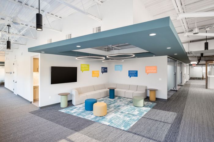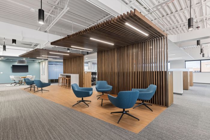 設計優(yōu)化了整體空間,以兩個開放式樓梯為中心。第二層側重于工作空間,第一層主要以公共空間為主,設計師提供了協(xié)作解決方案,其中包括一個帶有可移動隔板的培訓室和休息室。這個空間可以讓全國的團隊進行培訓活動。