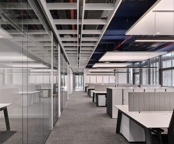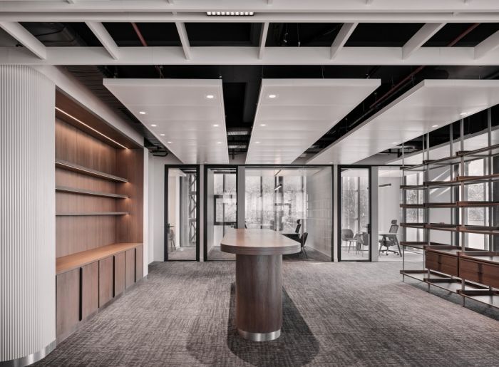 這是一個(gè)金融行業(yè)的辦公室,在這個(gè)3200方的辦公室中,公司在不同領(lǐng)域的相關(guān)部門被設(shè)計(jì)在一起,而工作空間則以線性規(guī)劃方案布置。