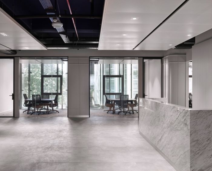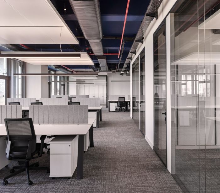 在該項(xiàng)目中,人力行政部門位于一樓;技術(shù)部門位于二、三樓。會(huì)議室和休閑區(qū)也根據(jù)需要布置在每一層。整體空間的白色調(diào)用于營造寬敞的氛圍。天花板被漆成深藍(lán)色,同時(shí)使用灰色調(diào)的技術(shù)設(shè)備,提供統(tǒng)一性。會(huì)議室和行政室的家具、柜臺以及儲(chǔ)藏室均采用定制,而開放式工作區(qū)則采用標(biāo)準(zhǔn)辦公家具。