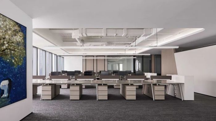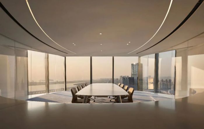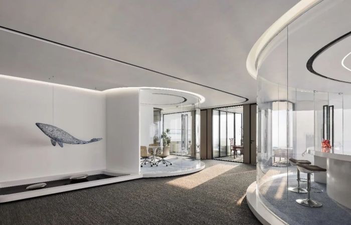空間中充滿海洋文化的氣息,懸吊的鯨魚藝術裝置成為空間的導言,歡迎人們深入其中。員工區呈現開放交流的狀態,便于員工間的密切合作。整體的空間型態,如展翅的鯤鵬翱翔于大海之畔。