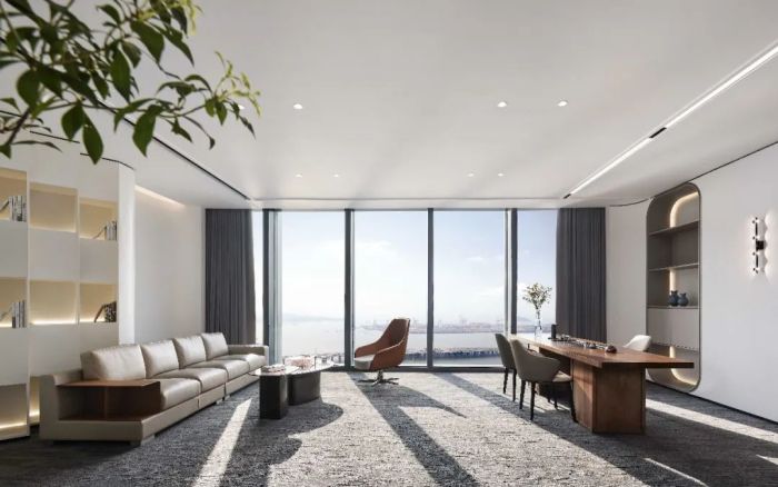 這是一個金融行業公司的辦公室,有1100方的面積。設計目的是營造舒適健康的金融商務空間,并體現一種帶有大地藝術氣質的室內美學。設計風格采用大而平順的弧度和圓潤的造型,注入了柔性力量。