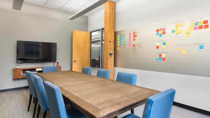 會(huì)議室的設(shè)計(jì):設(shè)計(jì)師的重點(diǎn)在于釋放空間的壓力,也就是釋放更多的空白空間,以此在會(huì)議開展的時(shí)候?yàn)槠髽I(yè)帶來更多的想象空間,想象空間就是希望讓大家靜下心來認(rèn)真思考,同時(shí)也為大家提供了踱步的空間,希望通過動(dòng)與靜之間的互換達(dá)到快速解決問題的作用。