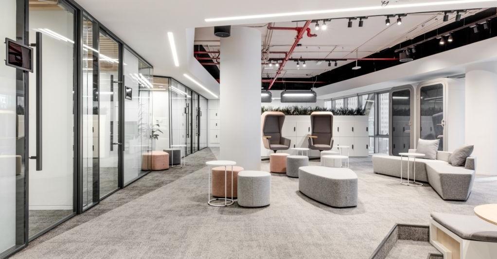 每個工作站都是坐著的,除此之外還有專用的高工作臺和站立會議室。還有一個專門為哺乳母親提供的空間,以及休閑咖啡廳式的座位,供非正式聚會和單獨工作使用。這個空間被劃分成用靜音顏色(泰爾綠色、天藍色和鮭魚色)來識別的區域。
