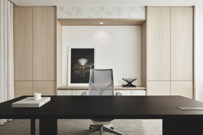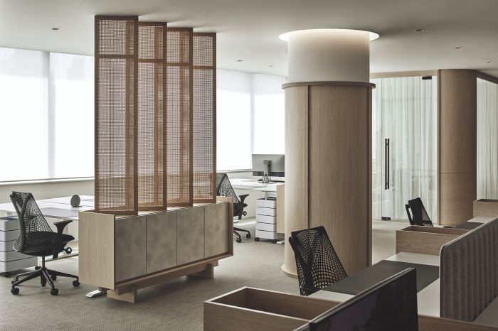 這是一個冷淡風(fēng)的辦公室,辦公空間從入口到室內(nèi)內(nèi)部,每一個元素都給用戶提供了一種幸福和平靜的感覺。空間內(nèi)部整體為開放式辦公室,區(qū)域或者隔間中使用百葉窗和藤條屏風(fēng)進(jìn)行分隔。