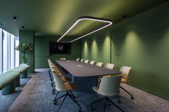 他們試圖打造一個能展現企業文化并能激發團隊熱情的辦公場所。所以空間減少了實體隔墻,以展現開放的辦公文化。運用塊面色彩、幾何形式、通透的玻璃隔墻去界定各功能區域,形成沒有視覺阻隔的開敞空間感。這樣的設計也正好契合公司致力于互動與協作的工作精神。
