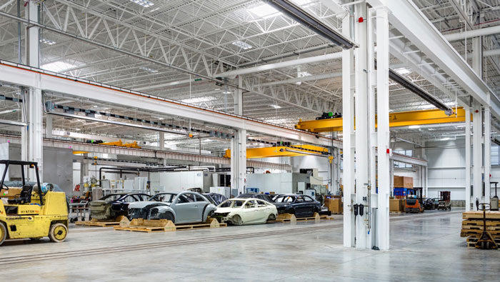 汽車工廠車間裝修設計:這里是存放汽車供應商,提供汽車原型的地方,汽車原型在這里等待被上裝,整個空間需要保證絕對的暢通,這也是設計師設計的重心所在。