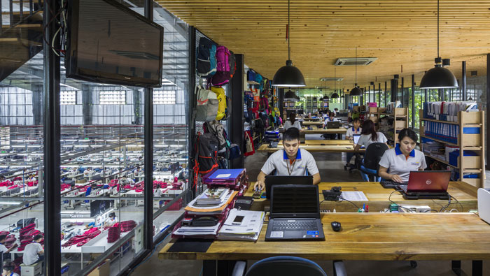 服裝廠房設計立面:從廠房設計立面可以看到,整個開放式的廠房設計,為廠區提供了優質的辦公環境,整個空間行動自由、光線和自然冷卻的綠色空間,打造了一個優質的工作場所。