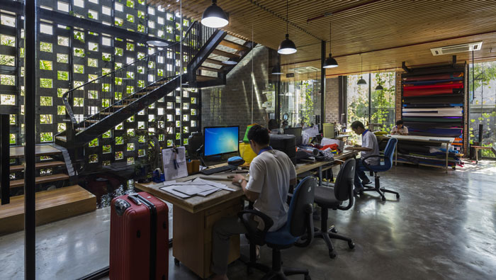 服裝廠房二樓辦公區裝修設計:綠色在整個空間隨處可見,這都歸功于外界的綠植藤蔓,這些天然的綠植,將空間裝扮得自然、舒適,這也正是自然的魅力,廠區與自然和諧相處。