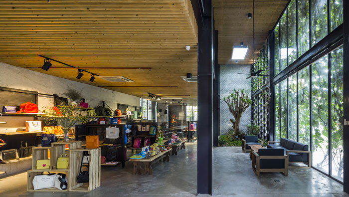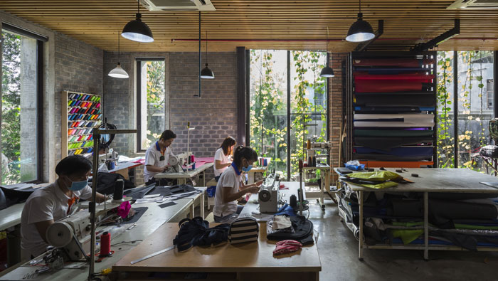 服裝廠房墻體裝修設計:通透是此類建筑的初心,通保證室內與室外空氣的流通,透保證陽光透過這里進入室內,這樣相互之間的互動,產生了一個通風、自然、舒適的空間。