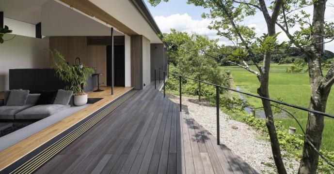 由于部分地盤是傾斜的,因此通常有需要建造一條擋土墻,以便為興建該幅土地作好準備。我們利用這一情況,創造了一個從地基伸出的地面,使之在半空中“漂浮”。高聳開放的居住空間和陽臺自然吸引了遠處可見的稻田和森林,激發了人們對不斷變化的自然世界的認識、與更廣闊的宇宙的聯系,以及一個人作為大自然一部分的地位。