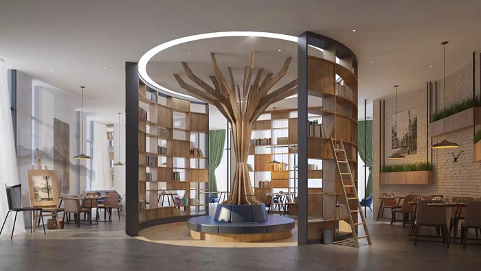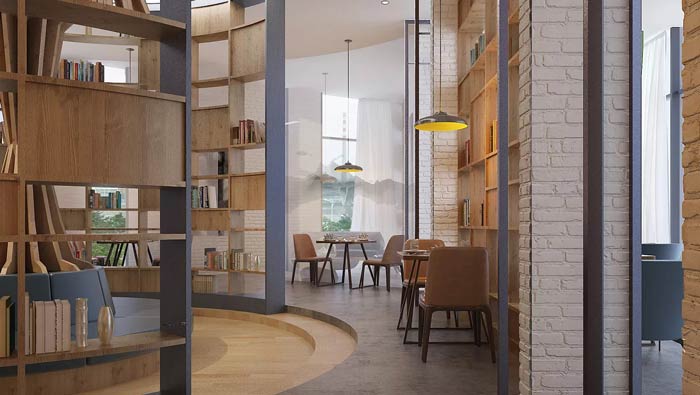 咖啡廳過道裝修設計:過道在這里不僅起到連接的作用,同時設計師也賦予了其接待、休息的屬性,桌椅擺放在過道的外緣,以此滿足客戶在空間中的休息與閱讀。