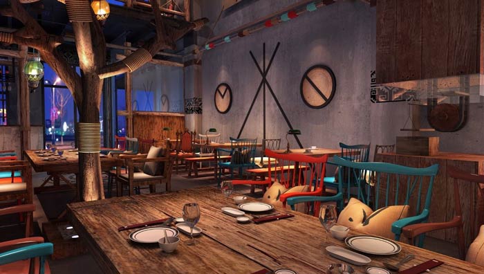 燒烤店一樓餐區設計:餐具、餐桌、餐椅、裝飾都充滿了原始的氣息,這里是木材的天下,在這里讓我們感受到木制品的魅力,在這里客戶尋回了屬于我們的美好生活。