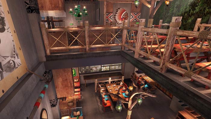 燒烤店俯視圖設計:整個樓層共分為兩層,進入空間后給客戶的第一感覺就是原生態,在這里沒有鋼鐵水泥,有的是用木材搭建的各個平臺,在這里讓客戶享受到不一樣的就餐環境。