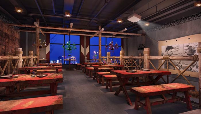 燒烤店一樓餐區設計:此處給人的第一感覺好似是一個原始部落,客戶在這里就餐會感受到不一樣的氛圍,安靜的空間氛圍,仿佛時間都慢了下來,讓客戶靜靜的享受美食。