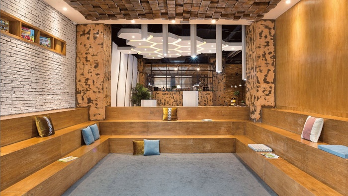 教育培訓閱讀區設計:在此處設計的時候,設計師的想法就是希望閱讀可以和玩耍結合在一起,設計師以四方格做為基本框架,以階梯狀打造閱讀區,中間自然凹陷是孩子玩耍的區域,勞逸結合正是此處的最佳說明。