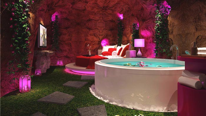溫泉客房的設計:別樣的洞房花燭夜,都說人一生一中有兩件大事,就是金榜題名時、洞房花燭夜,但是這些對于我們現在的人來說,是那么的陌生、也是那么的向外,相信每一對戀人都有這樣的期許,設計師就是以此情此景為大家帶來這樣的設計,讓戀人在這里完成一次心靈的升華。