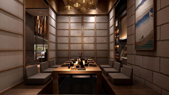 日式料理餐廳包廂設計:餐桌位于一個斷層當中,這樣客戶在盤坐的時候,腳也可以往下伸,這符合國人的習慣,這就是餐廳設計本土化的最好見證,只有如此才能夠相互互補。