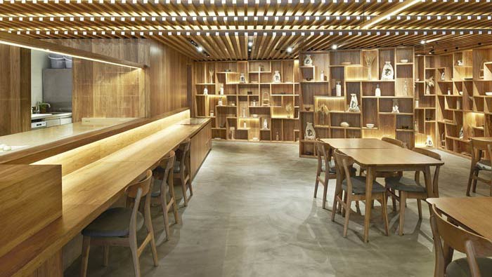 日式餐廳吧臺(tái)設(shè)計(jì):吧臺(tái)可以清晰的看到廚師的一舉一動(dòng),從這一點(diǎn)也可以看出餐廳的信心,廚師從開(kāi)始做到端上來(lái),每一個(gè)細(xì)節(jié)都躲不過(guò)客戶的眼睛,讓客戶參與其中。