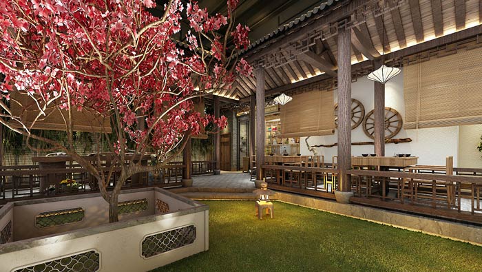 特色私房菜館庭院設計:庭院是空間給人的第一感覺,這也是設計師希望看到的,從整體看整個空間,無一不展現著中式的魅力,設計師希望打造一個區別于現在的設計。