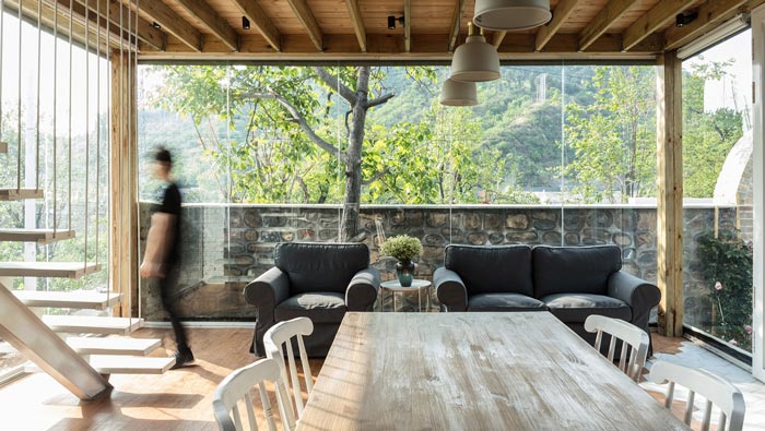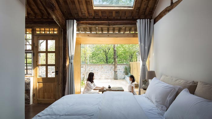 本案為鄉村景區民宿改造,改造策略為保留原有木結構,更新部分外界面,拆除原有破敗的屋頂,增加保溫層和防水層,增加天窗,并將原有的小青瓦回收再利用。