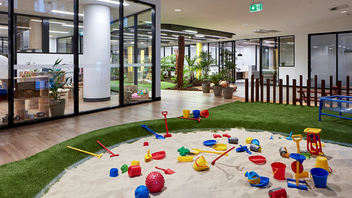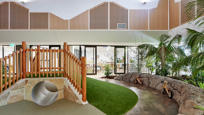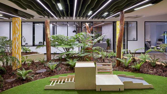 早教中心自然區設計:這里還原了很多自然屬性,孩子對于世界的認識是初步的,設計師希望讓孩子在這里逐步去了解自然,讓孩子通過自己不斷的發現,激發孩子的想象力。