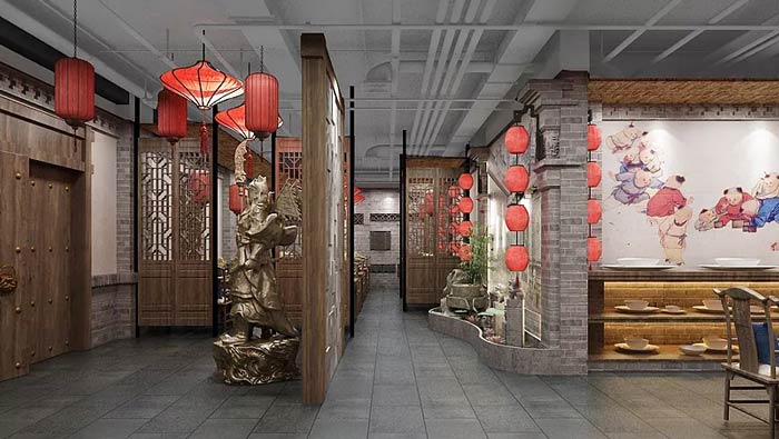 中餐廳過道設(shè)計:空間由一條主通道貫穿前后,空間左側(cè)擺放的是關(guān)公像,希望保佑餐廳可以順順利利,右邊是餐具區(qū),墻繪表示的是小孩子玩耍的場景,讓客戶在這里尋回小時候的身影。