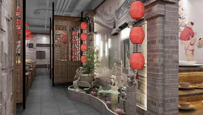 中餐廳中庭設(shè)計:客戶從這里進入內(nèi)部空間,這里有石獅子、荷花、燈籠、大宅,各種不同的中式元素匯聚在這里,給人一種回家的感覺,在文化回歸的大環(huán)境下,這樣的氛圍更受人喜歡。