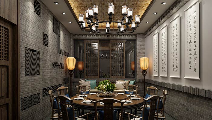 中餐廳包廂設(shè)計:包廂由餐區(qū)、休息區(qū)構(gòu)成,餐區(qū)滿足空間原本的屬性——聚餐,休息區(qū)是為交談、聊天所設(shè)定的,當需要交流的時候,休息區(qū)就派上了用場,如此是不希望打擾到其他人。