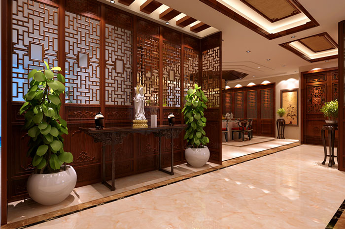 禪意可以將提升別墅設(shè)計的意蘊與內(nèi)涵,因此案例中玄關(guān)布置特別選擇的觀音像來展現(xiàn)出禪的意境,讓人們來此首先就可以親身達到心如止水的美好體驗。