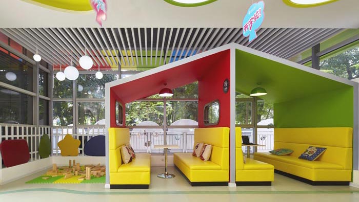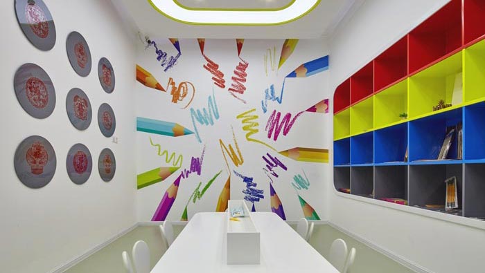 休息與洽談區(qū)的設(shè)計(jì):此次位于前臺(tái)空間的左前方,目的就是希望此地承載起接待的作用,讓客戶在此處可以感受到企業(yè)的辦學(xué)理念,空間的色彩設(shè)計(jì)師以活潑、鮮艷為主,同時(shí)空間格局以半開放式的形式展現(xiàn)出來,同時(shí)簡(jiǎn)易的小房子模型也給客戶一種家的感覺,積木的堆砌為孩子提供了一個(gè)玩耍的區(qū)域。