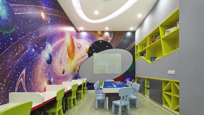 教學(xué)空間的設(shè)計(jì):此空間一共有5位同學(xué),在空間格局上分別為學(xué)習(xí)區(qū)與實(shí)踐區(qū),墻壁的一面使用星系壁紙,這樣就為學(xué)習(xí)區(qū)域創(chuàng)造了可能,因?yàn)樾窍当旧砭陀腥趸曈X的效果,讓人感受到星系的浩瀚,而忽略墻壁這個(gè)真實(shí)的存在,實(shí)踐區(qū)在于鍛煉孩子動(dòng)手的能力,讓孩子們健康快樂的成長(zhǎng)。